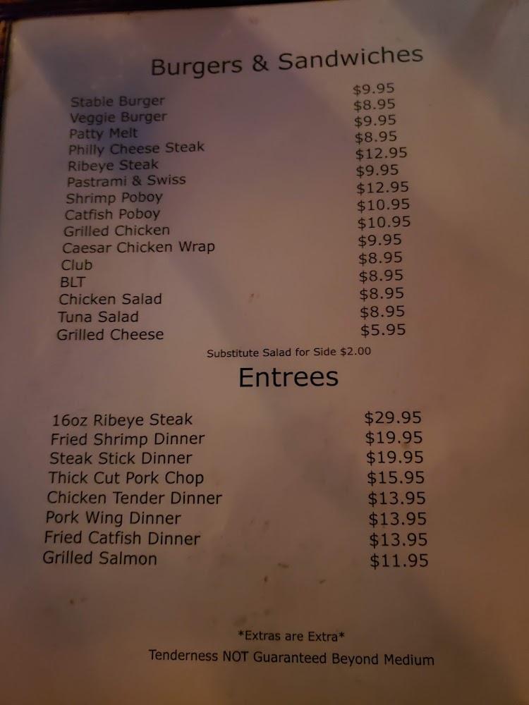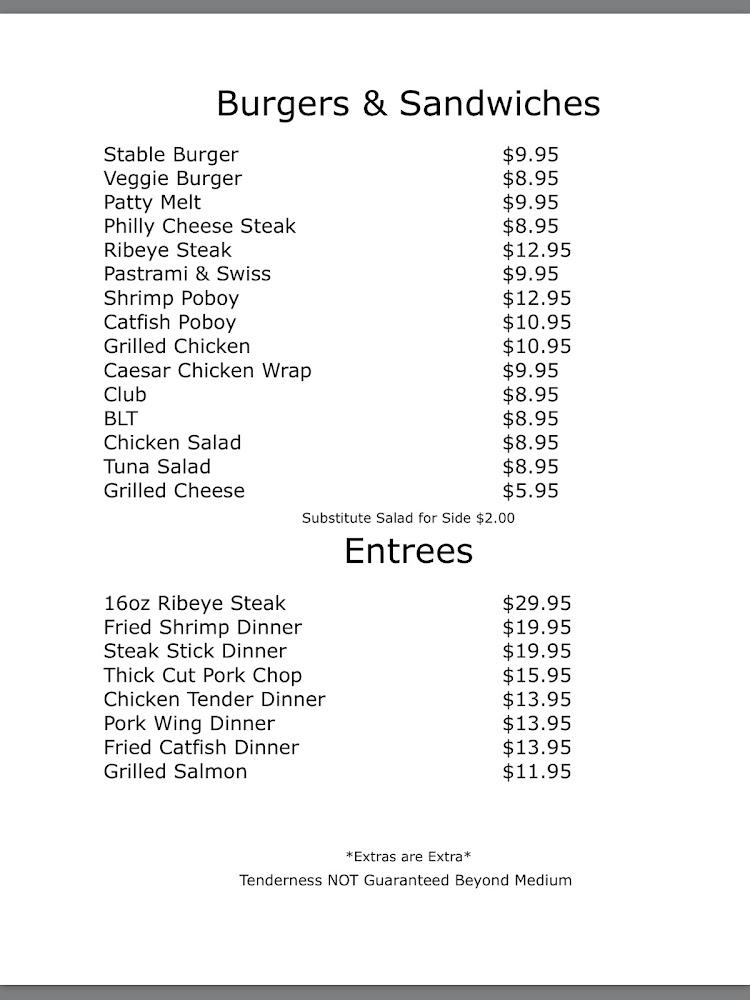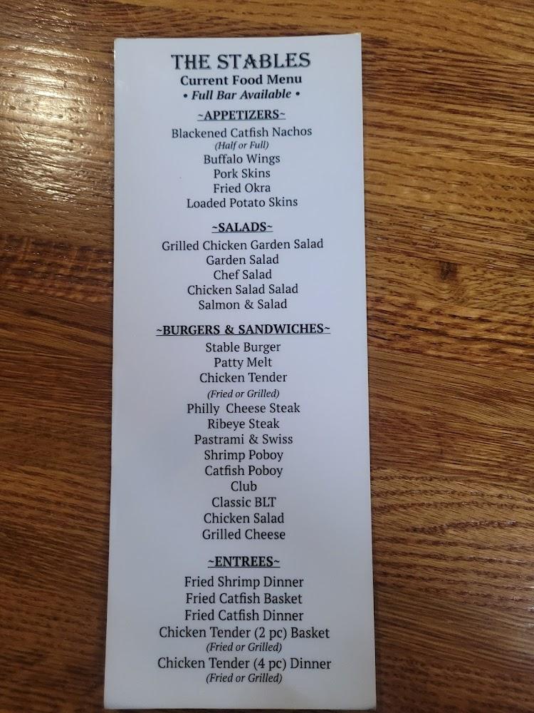 The menu at The Stables Downtown Grill features a hearty selection that caters to a variety of tastes. Starters include crowd favorites like Blackened Catfish Nachos, buffalo wings, and fried okra. For those seeking lighter options, salads provide a fresh start. Burgers and sandwiches take center stage, with the Stable Burger and Philly Cheese Steak leading the pack. Entrees range from a 16oz Ribeye Steak to chicken tenders, ensuring something for everyone. The offerings reflect a blend of classic American dishes with local ingredients. Each meal highlights flavor and showcases the talent of the kitchen staff. Diners can easily share meals thanks to generous portion sizes, making it perfect for groups.